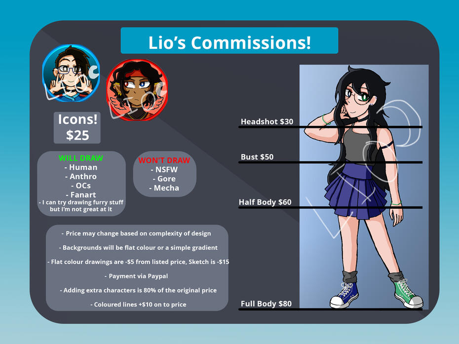Contact me through any of the below sources to set up a commission or ask questions! (if the discord link doesn't work my username is guiltygearofficial)Payment through Paypal but other options can be discussed